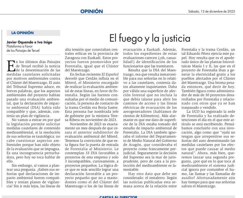 Resulta que la DIA del Maestrazgo, esa que resulta inmarcesible para sus señorías en lo relativo a las cautelares, contenía datos altamente inquietantes. Daba por válida una superficie de afección forestal que no incluía la que debía talarse para abrir los caminos de acceso y las líneas eléctricas de evacuación de los aerogeneradores (hablamos de cientos de kilómetros). Más alarmante es que ese dato de superficie de la DIA estaba tomado del estudio de impacto ambiental de Forestalia. La DIA también ignoraba el informe del Departamento de Medio Natural del Gobierno de Aragón, que consideraba el proyecto como francamente perjudicial. Seguramente la decisión del Supremo sea la mar de jurisprudente, pero de cara a la protección del medioambiente es lamentable.